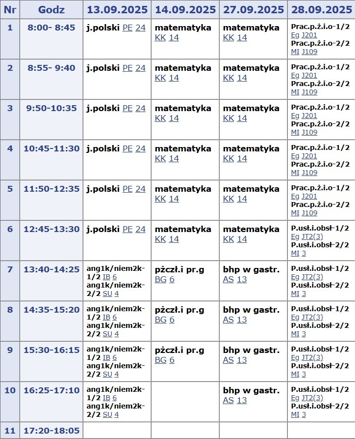 Plan lekcji w budynku warsztatów przy ulicy Jedności Robotniczej 38 – 2024/2025